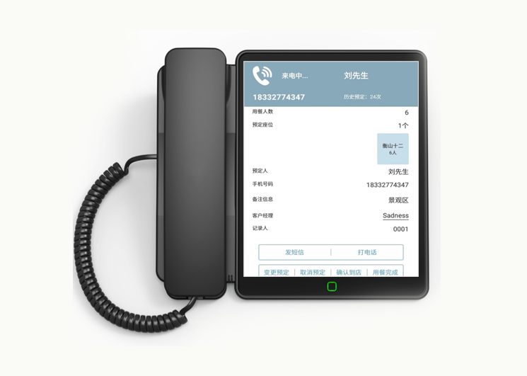 - 客户来电时,自动识别客户信息,引导餐厅人员进入新预订、已有预订等多个场景操作;