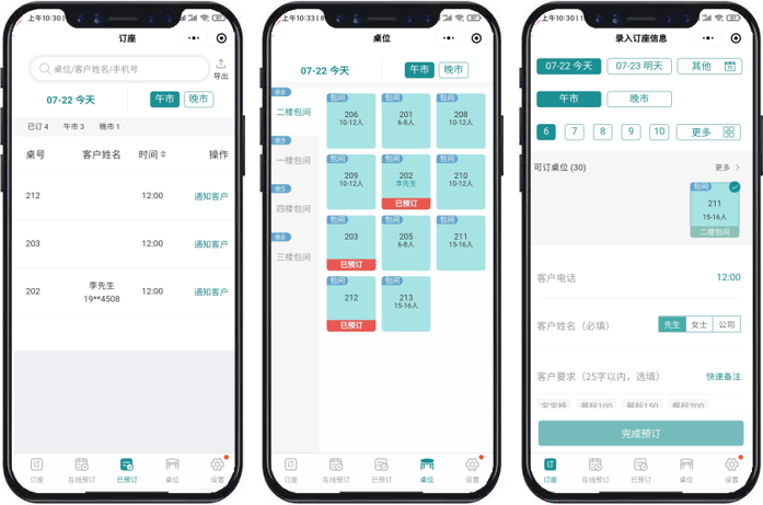 - 随时随地,通过手机APP可以查询包间桌位占用情况,按需完成客户预订;